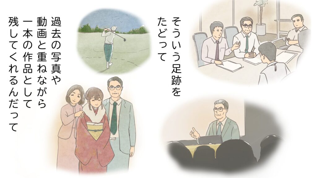 本人の語りがある映像はもちろん、ご家族からのお話や写真・イラストをもとに、“その人らしさ”を感じられる作品に仕上げます。