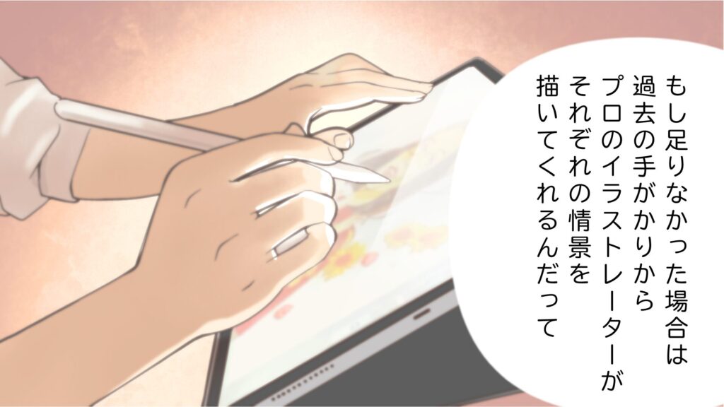 プロイラストレーターによるイラスト補完 | お見積もり | 写真や映像が不足する場面を、プロのイラストで補います。 |